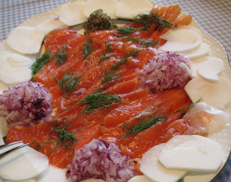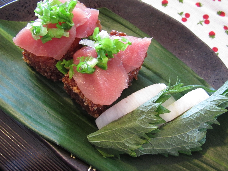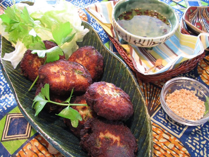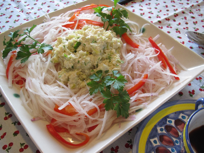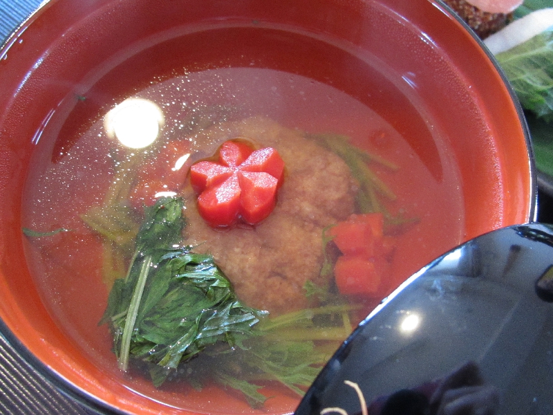 レンコン団子と梅人参の吸い物・寿司の前菜・青紫蘇かまぼこ・チキンと大根のサラダ・モシチキリ(ウズベキスタン)・ミニマフィン(アメリカ)