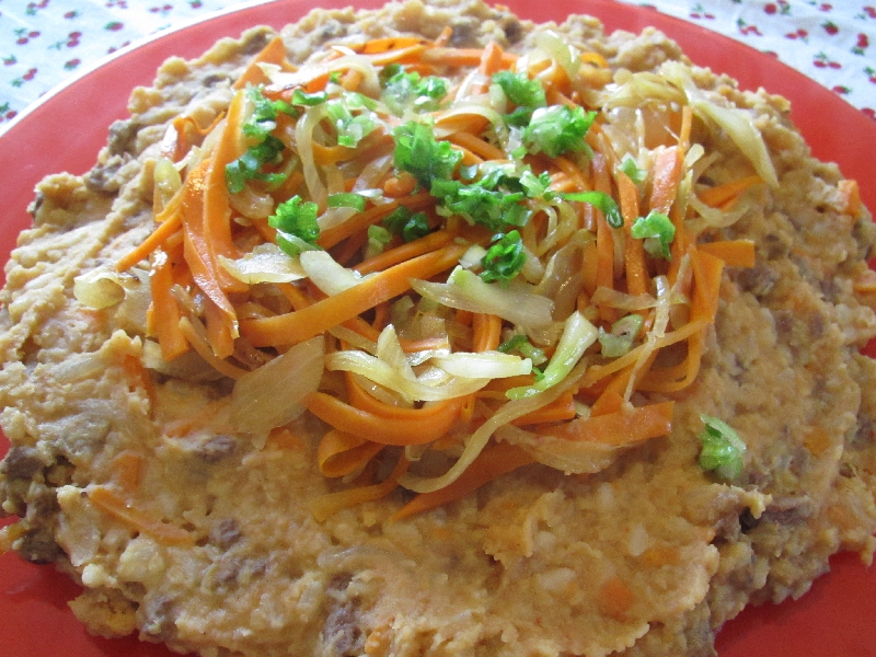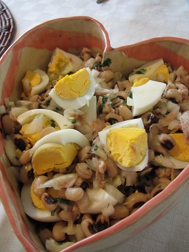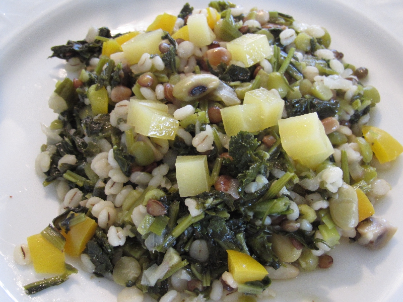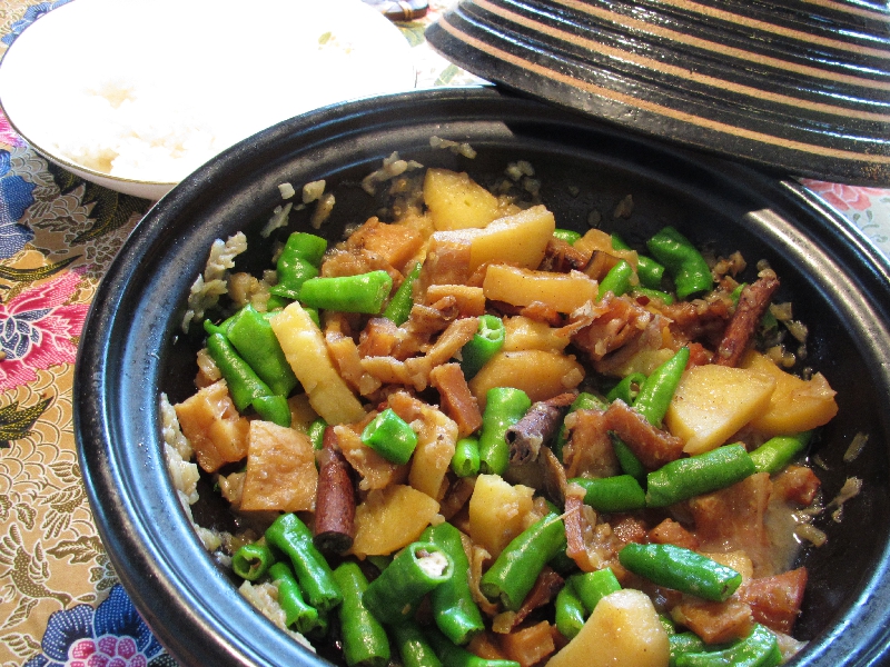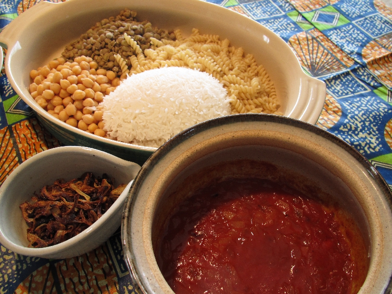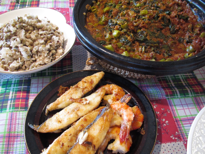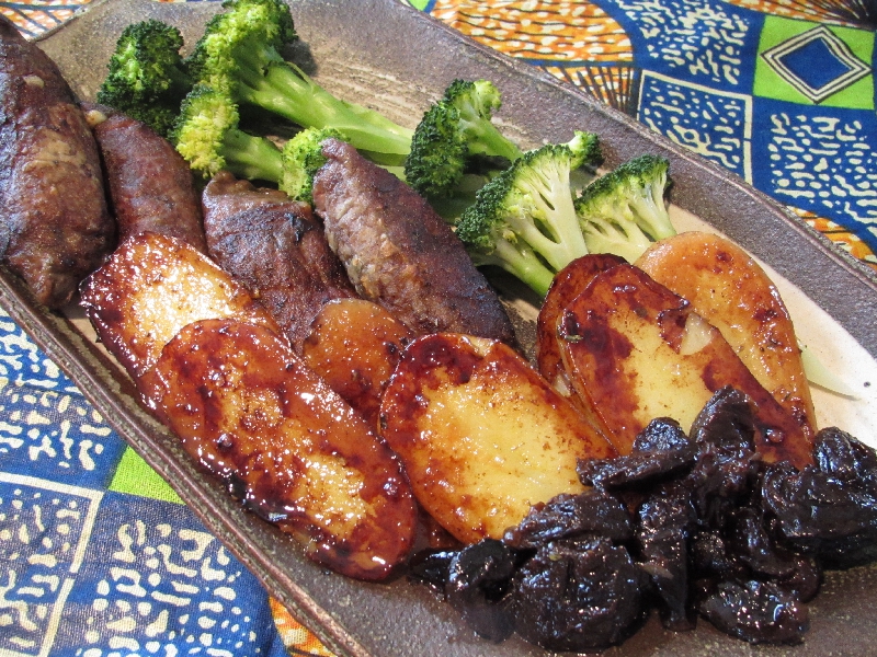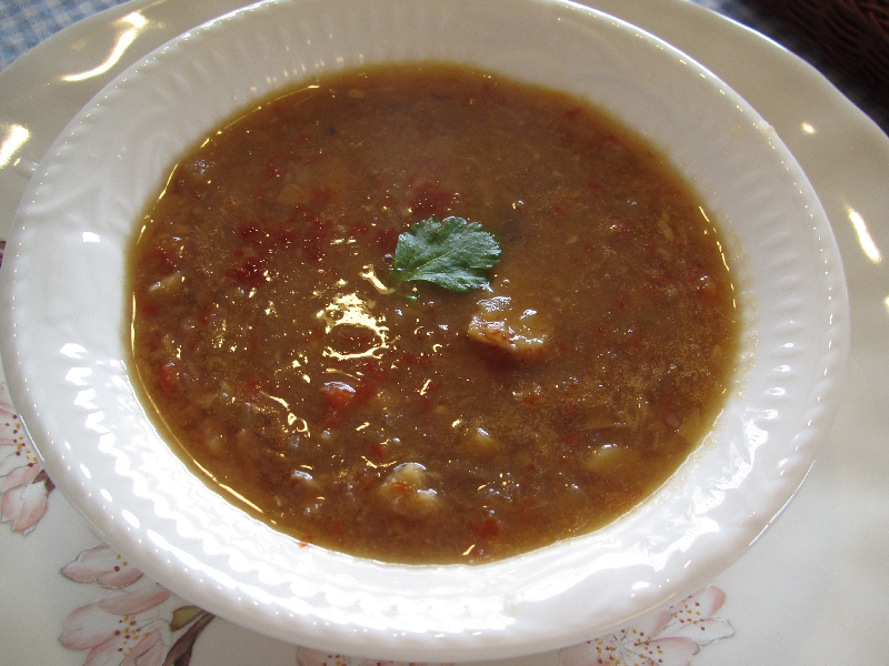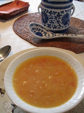 ・ベジタブルスープ・ブラックアイビーンズのサラダ・ソーセージ・アンコーの炊き込みごあん・薩摩芋の煮込み