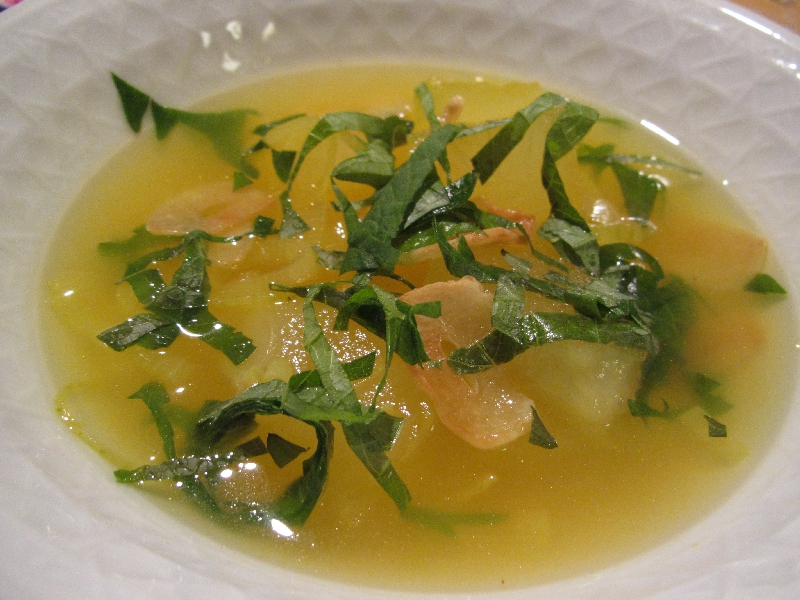 ・シュリンプとコーンのチャウダースープ・トマトのカクテル・ドライイチジクとクルミ・キューブ野菜のレリッシュ・ピリピリプラウン