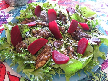 ・ビーツのスープ・牡蠣のサラダ・豆と野菜のキッシュ・クリーミーポテト・ベリーポロ・林檎とラズベリーのクランブル